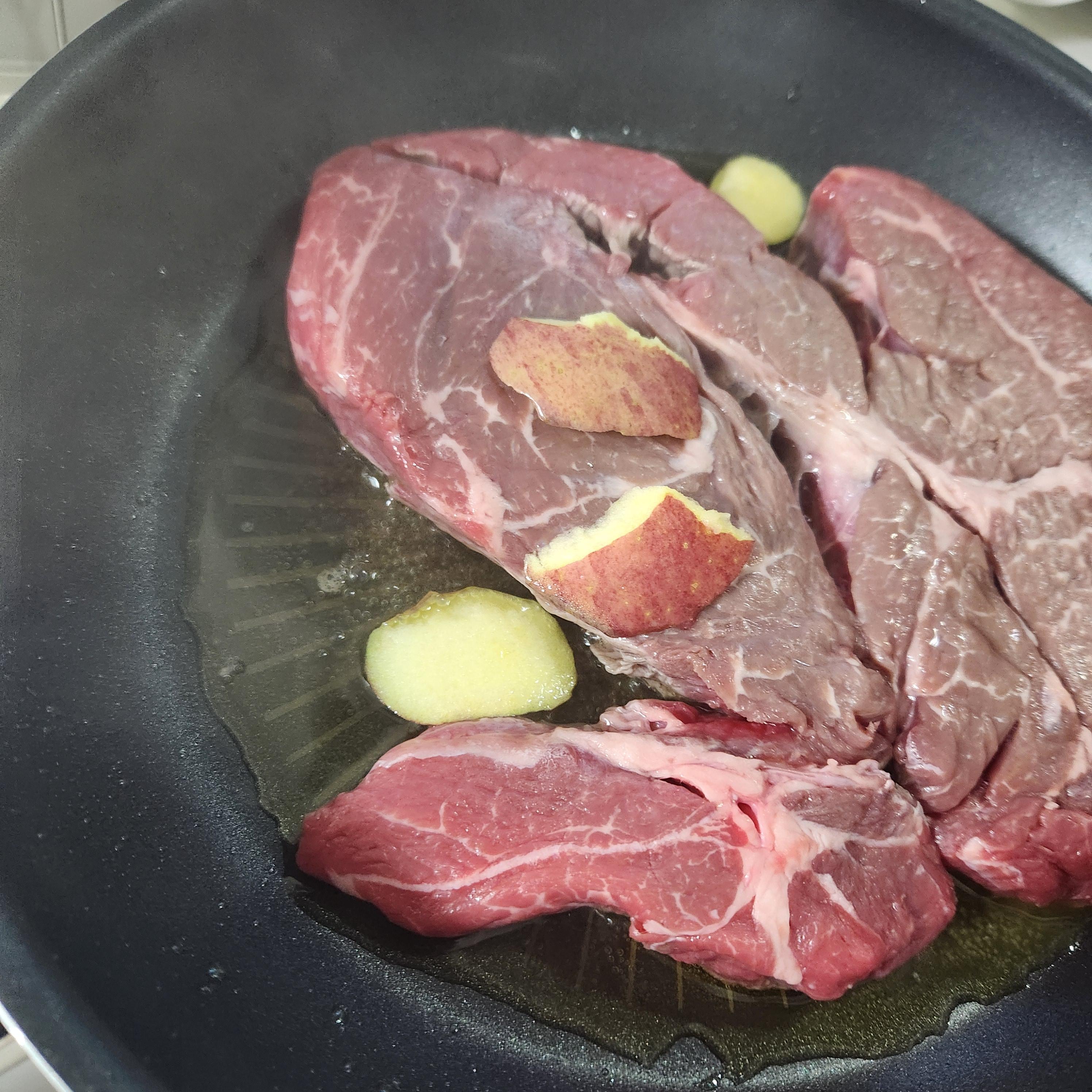 그리고 맛있는 고기를 올려놓고 사과껍질을 과도로 한 3조각 작게 떼내서 같이 올려줍니다. 전 고기양이 많아 4조각을 올렸습니다. 기름 위에 바로 올려도 좋고 고기 위에 올리든 옆으로 흘러 내려가 있든 고기 밑에 깔리든 아무 상관이 없습니다. 사과껍질에서 맛있는 향과 산미가 나와 고기를 부드럽게 만들어 줄 겁니다. 사과껍질은 항산화성분이 풍부하고 고기의 잡내를 제거해 줍니다.